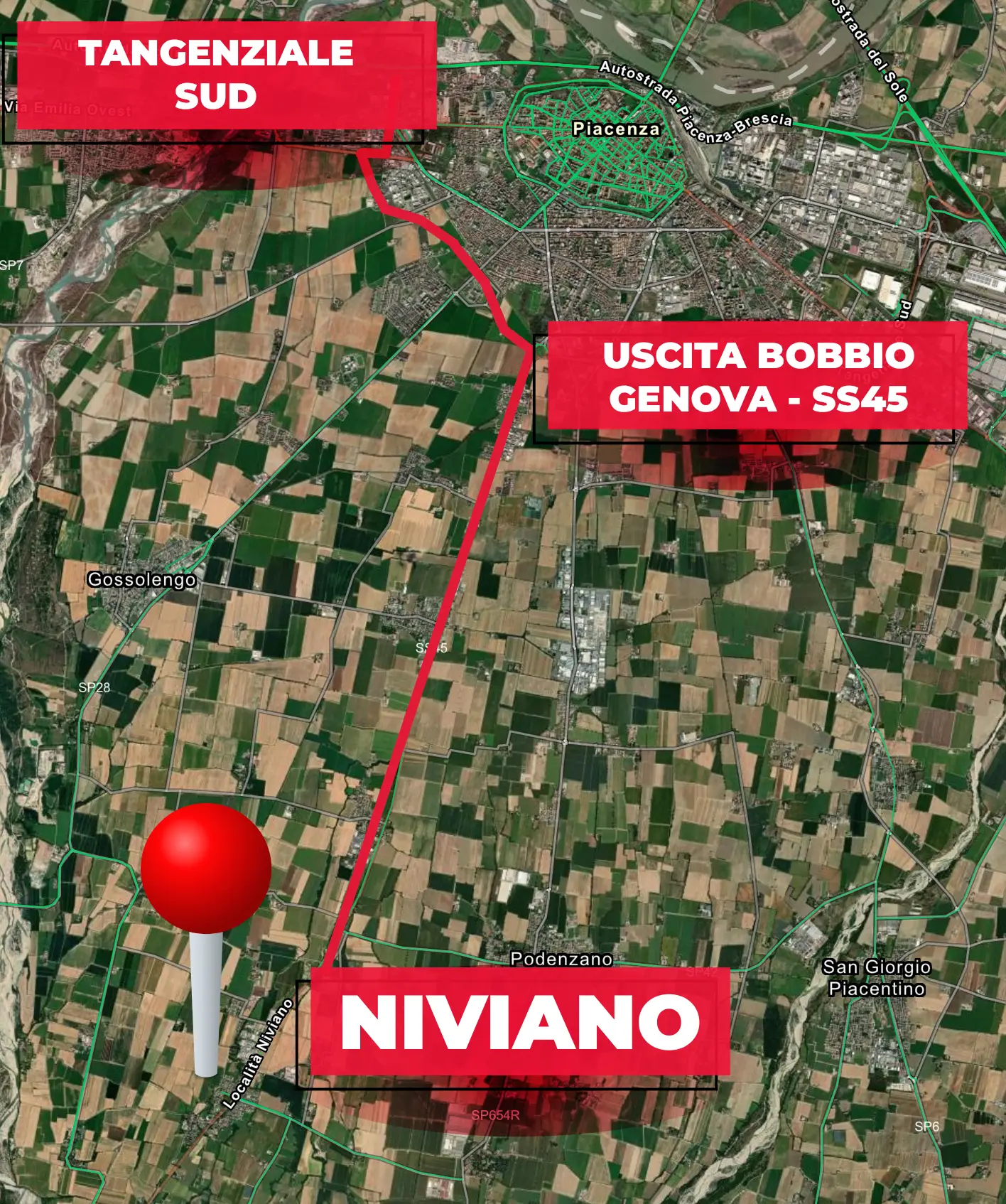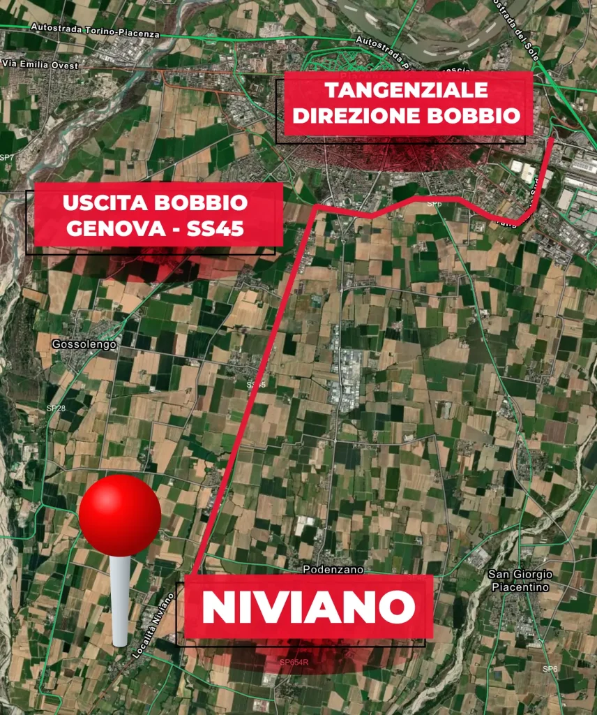 - Immediatamente dopo l’uscita, alla rotatoria prendi la seconda uscita e imbocca la Tangenziale in direzione BOBBIO